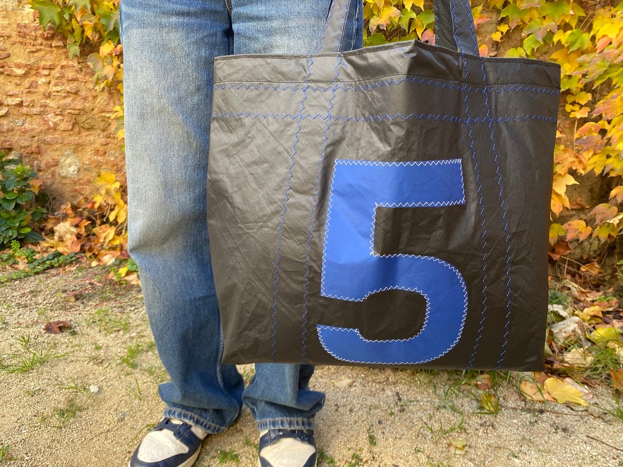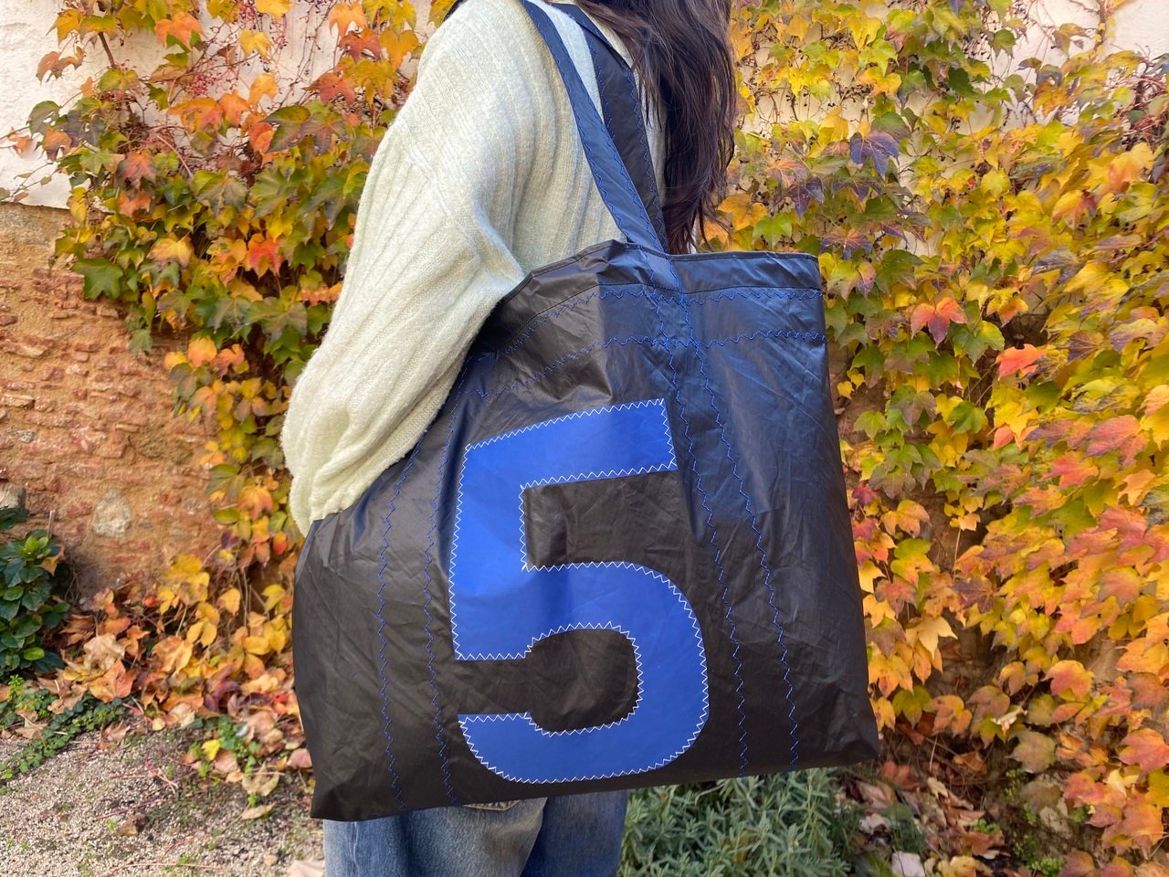 Cada vela tiene su propia historia y marcas de navegación, por eso conservamos sus costuras en color azul y pliegues originales. No hay dos bolsas iguales: cada una es una pieza única.