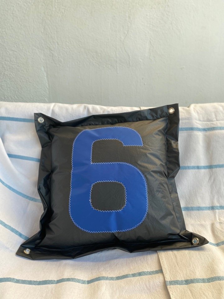 El cojín de vela negra reciclada Carbonera está confeccionado con tela náutica de barco (Spinnaker) 100% reciclada de color negro y costuras originales en azul, recuperada de navegantes que un día la hicieron volar sobre el Mediterráneo.